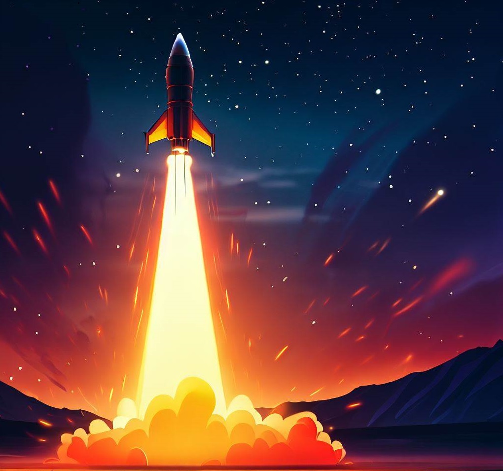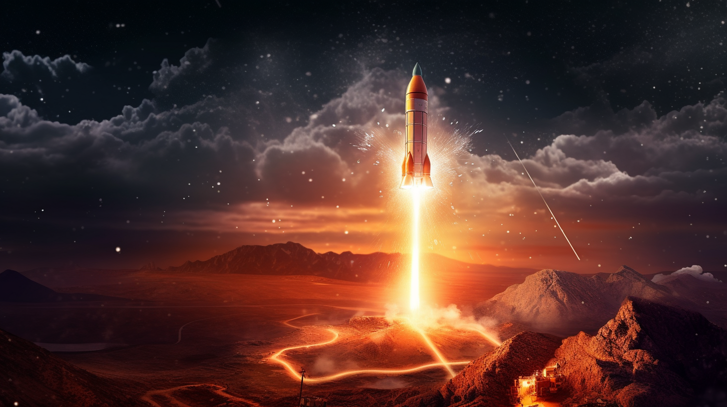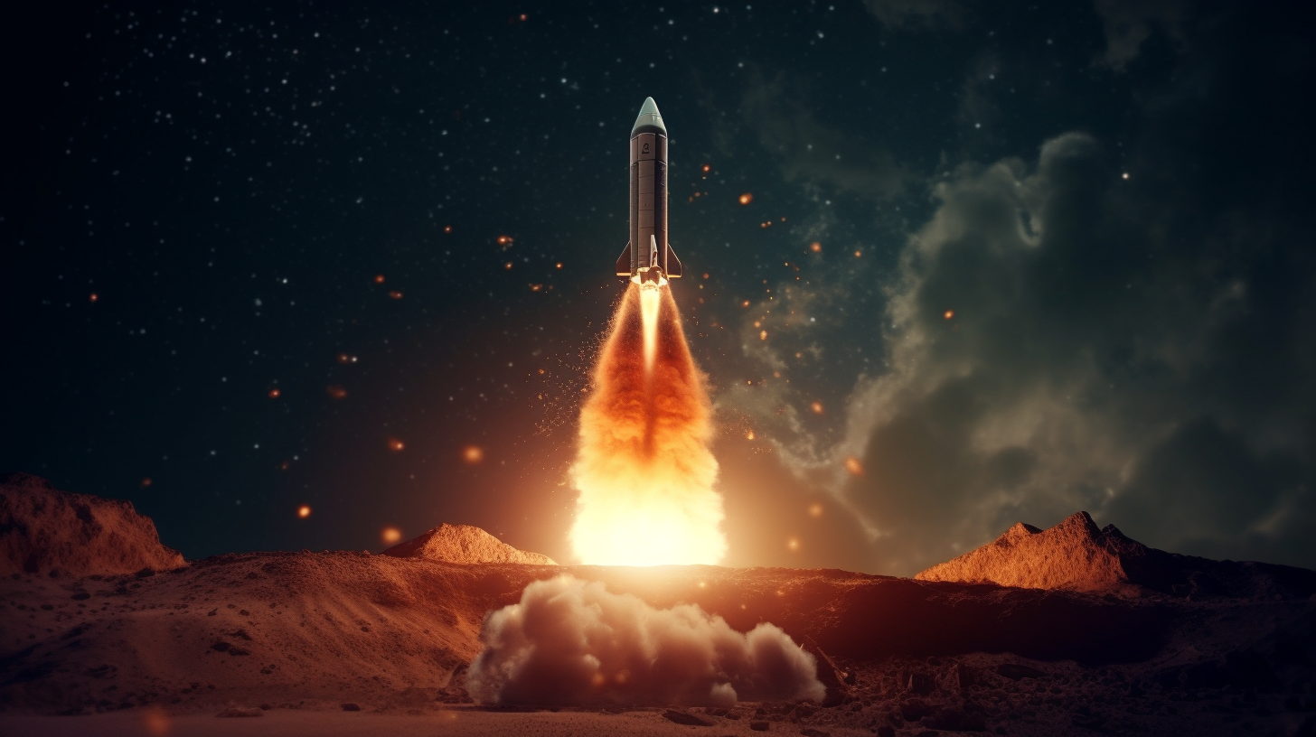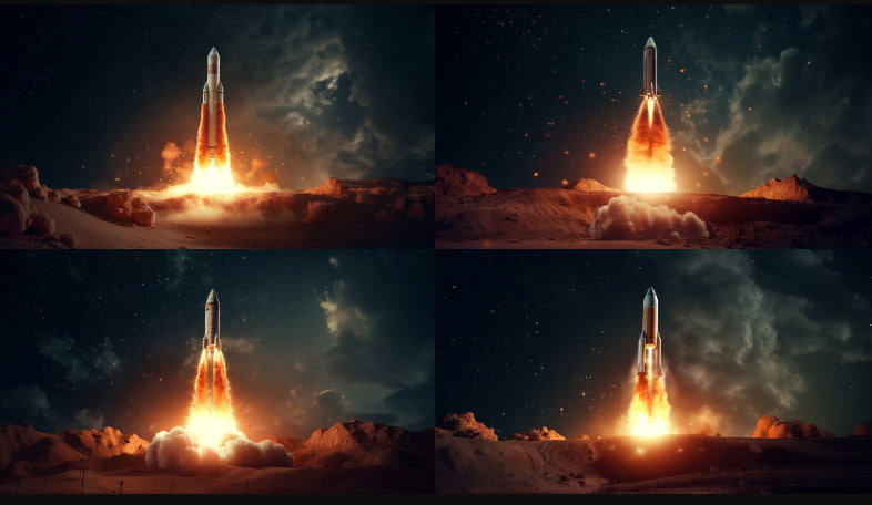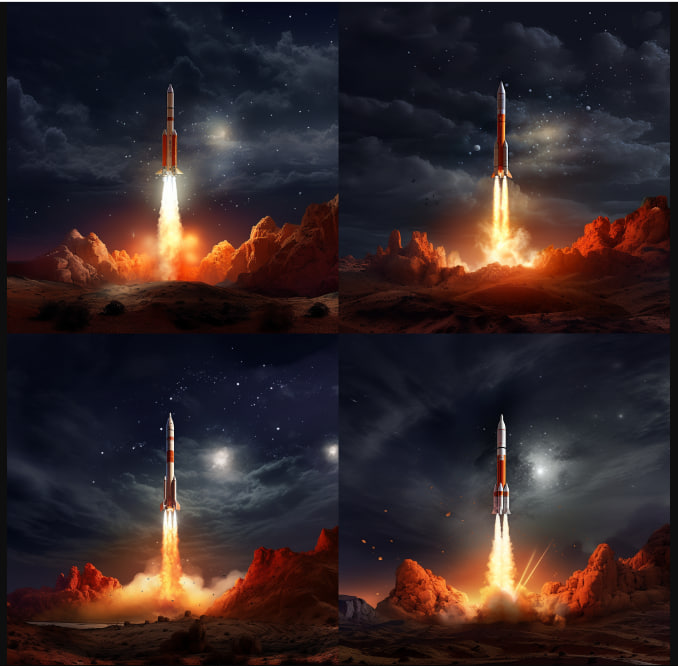 یه موشک که داره لانچ میشه و اتیش از زیرش زده بیرون (برای رسوندن قدرت برند، هویت برند ما قدرتمند بودنه) توی اسمون شب که توش ستاره و کهکشان هست