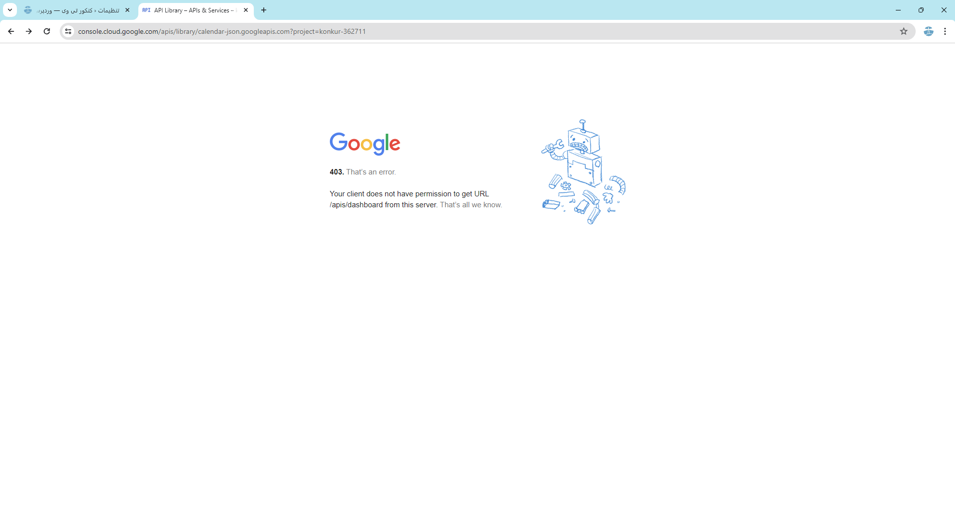 ابتدا من فکر کردم که مساله سر VPN است اما نبود سپس فکر کردم مساله سر اینه که اکانت من تحریمه اما نبود، چون با اکانتدیگری تونستم وارد محیط calender api بشم ، اما مجدد به خطا خوردم