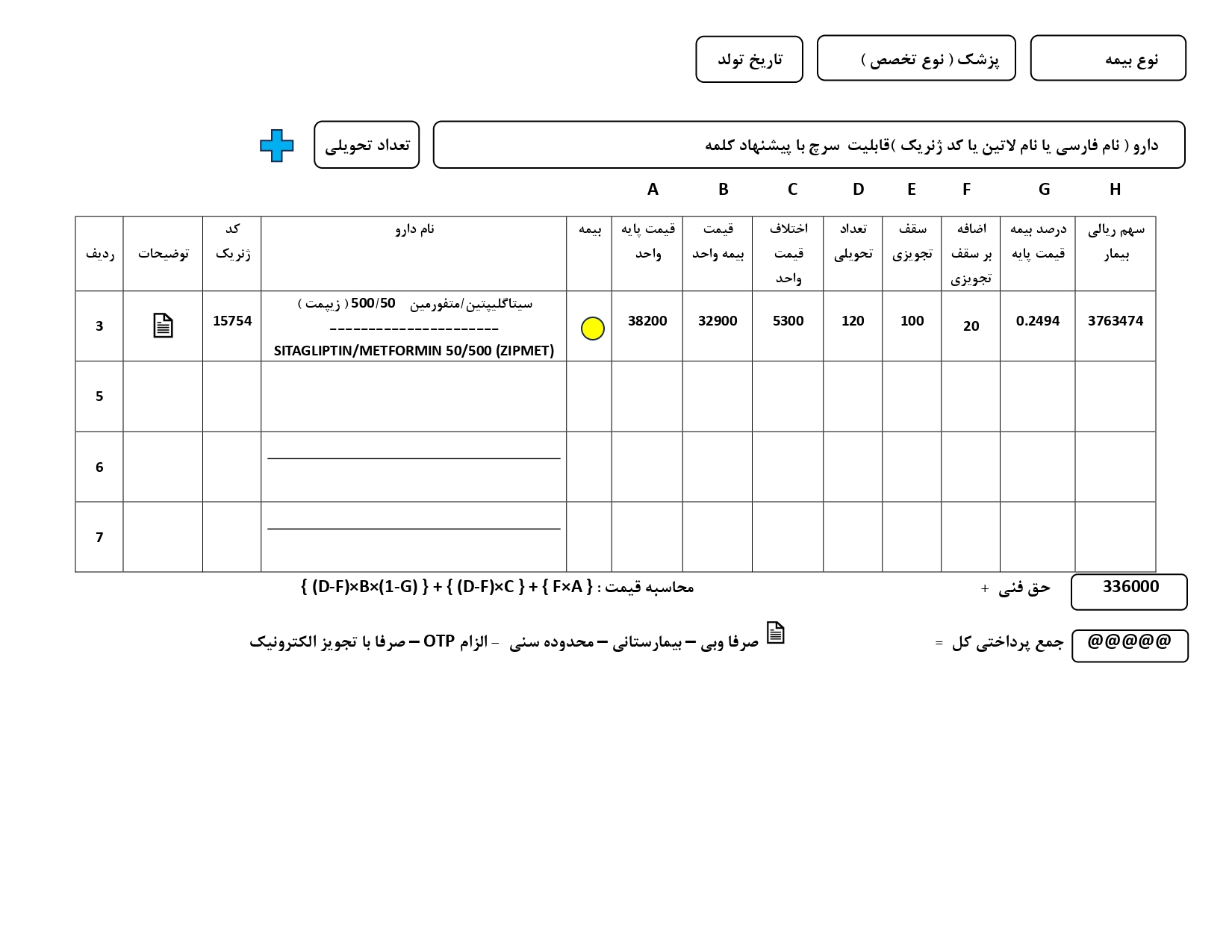 - فرمول محاسباتی: الگوریتمی باید طراحی شود که تمامی موارد فوق را در نظر بگیرد و مبلغ نهایی دارو را محاسبه کند.