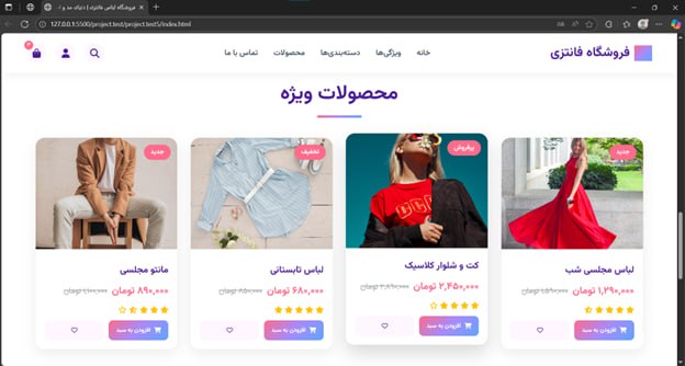 •    صفحه محصولات (قابلیت فیلتر بر اساس سایز، مدل و رنگ)