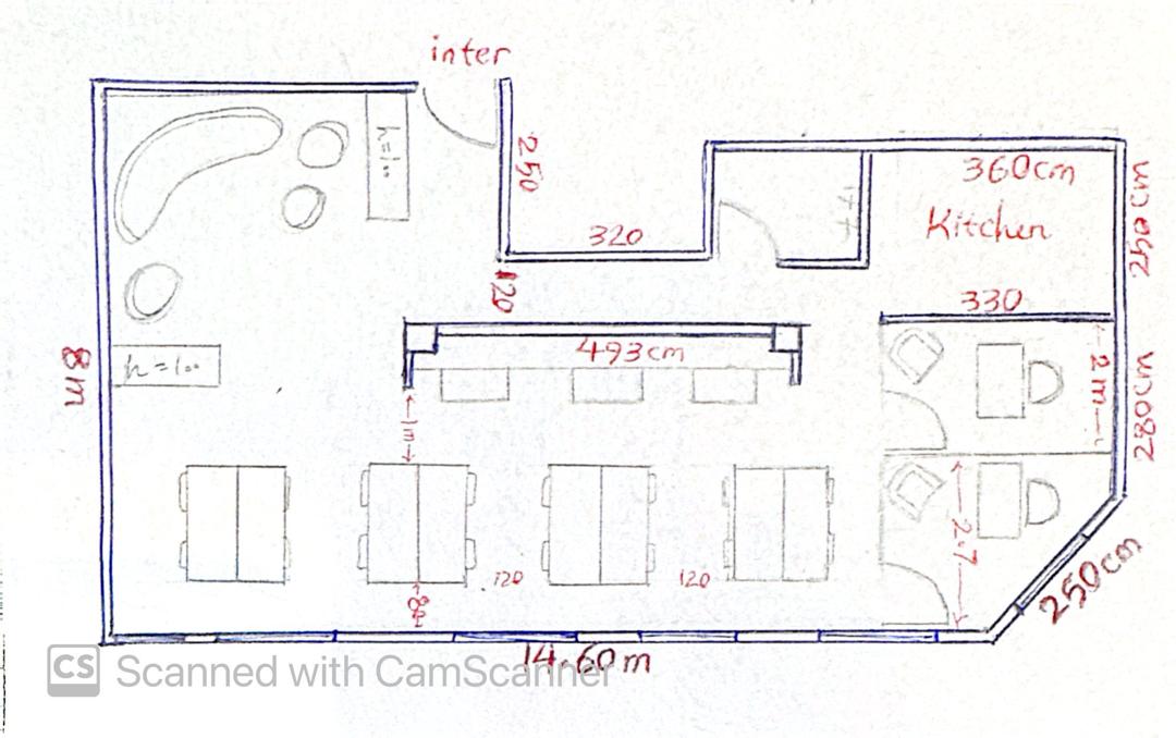 • و 12 متر باقیمانده برای فضای کاری و بخش ورودی (Entertainment + تعداد ۴ میز ۴ نفره میزهای اشتراکی)