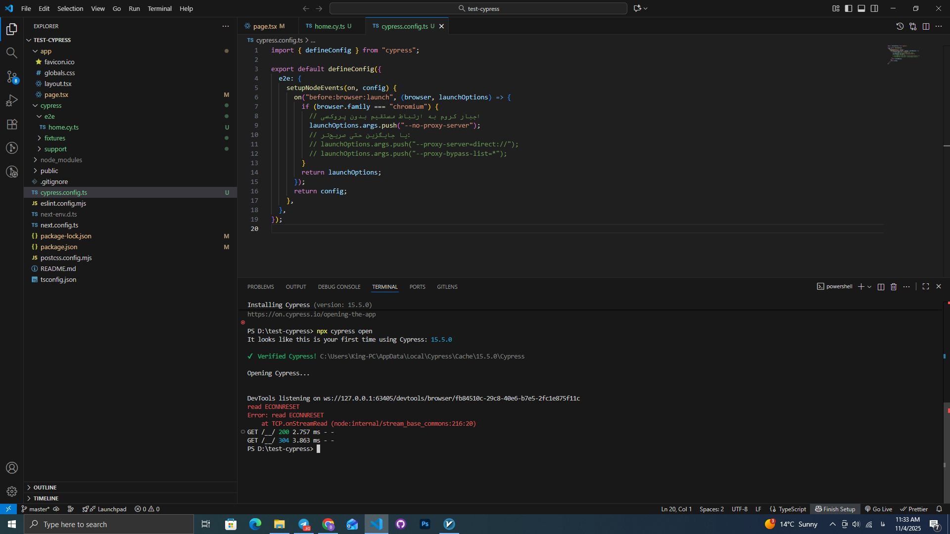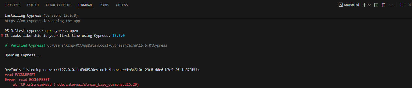 میخواهم cypress را روی پروژه موجود (next.js) اجرا کنم اما با این ارور مواجه میشوم. DevTools listening on ws://127.0.0.1:54974/devtools/browser/c3e771f1-b29d-417c-804e-51200372955d read ECONNRESET Error: read ECONNRESET