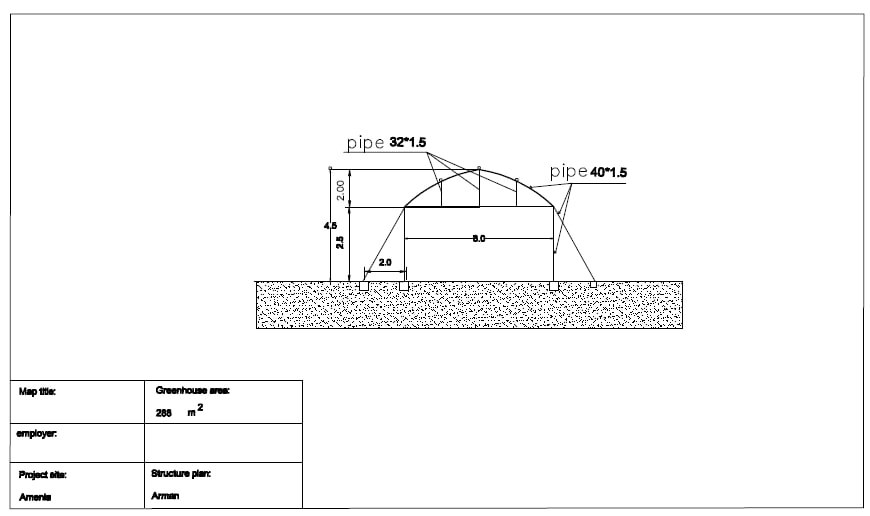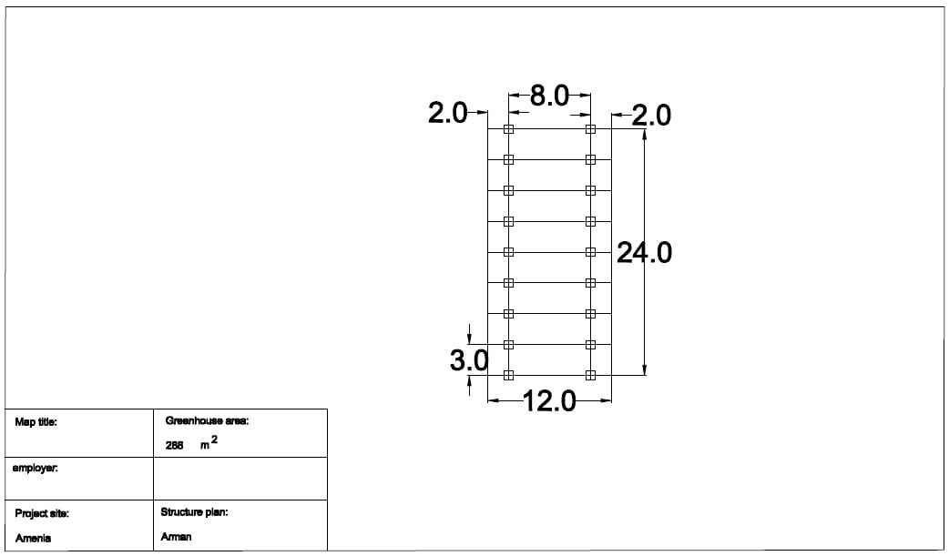 طول، عرض و ارتفاع گلخانه فاصله پایههای سازه نقشه 2D کامل گلخانه